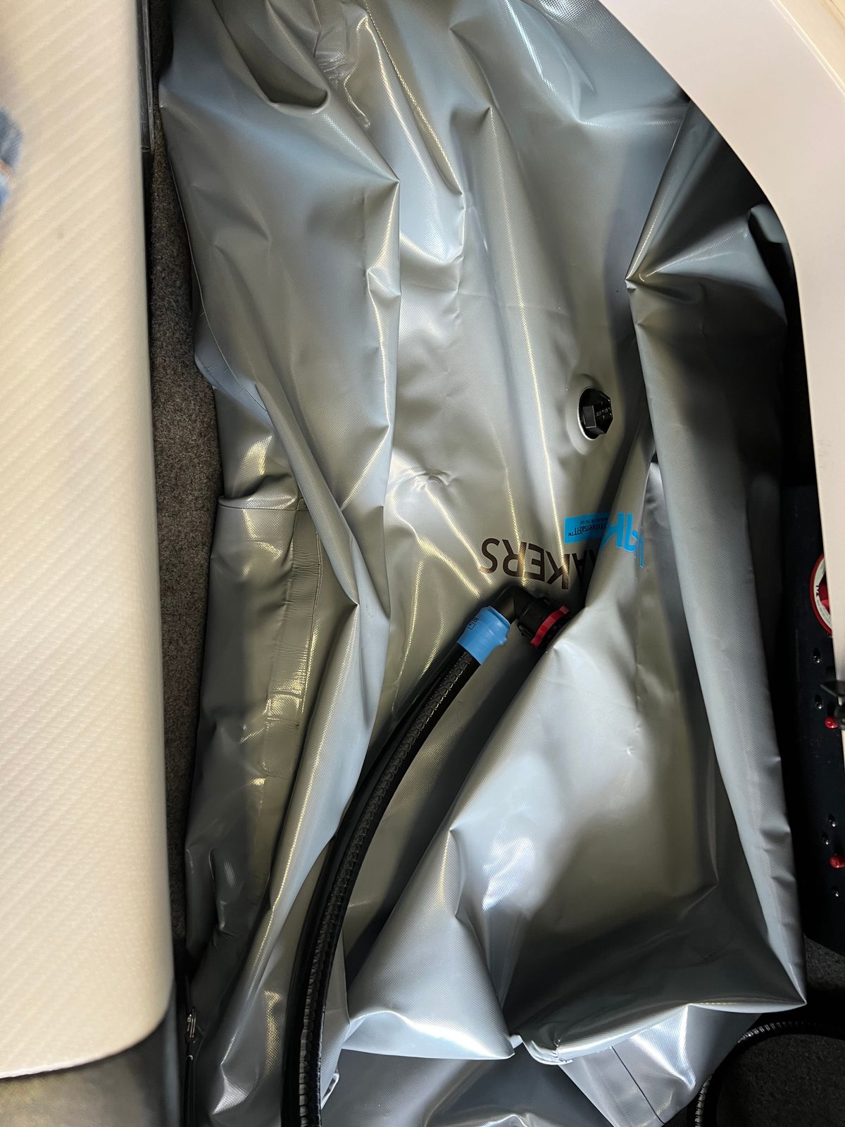 This upgrade kit "piggybacks" the included WakeMAKERS FIT Series ballast bags in this kit that are placed in the rear lockers on top of the factory hard tanks. The additional ballast bags are integrated into the rear factory ballast tanks for an automated fill/drain process using the existing pumps, hoses, and switches. With the PiggyBack system installed, once the factory hard tanks are full, excess water flows into the WakeMAKERS ballast bag and begins to fill it. Once the additional ballast bag is full (which means the factory hard tank is full), excess water flows out of the bag's overflow line and through the factory thru-hull fittings, allowing the system to function exactly the same as the stock setup. Draining is exactly the opposite; as the factory drain pump removes water from the hard tank, gravity forces water out of the WakeMAKERS bag and into the hard tank until both the tank and bag are empty. Your Nautique's ballast system functions exactly the same as the stock setup but with an increased capacity for better wake results.