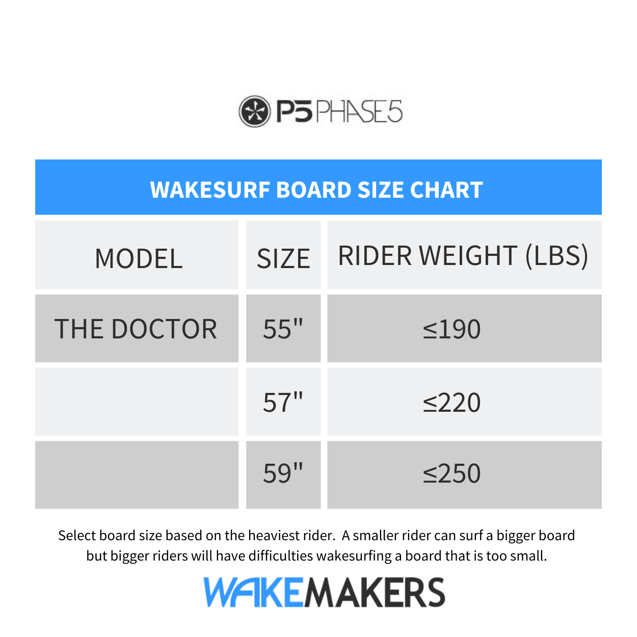One of the unique features of the Phase Five Doctor is its forgiveness, making it an ideal choice for progressing riders who are still learning to master their skills. The board comes in three different size options: 55”, 57”, and 59”, catering to a variety of riders. The 55” option is perfect for riders who weigh 200 pounds or less, while the larger 57” and 59” options are ideal for bigger and more experienced riders who want to take their wakesurfing to the next level.